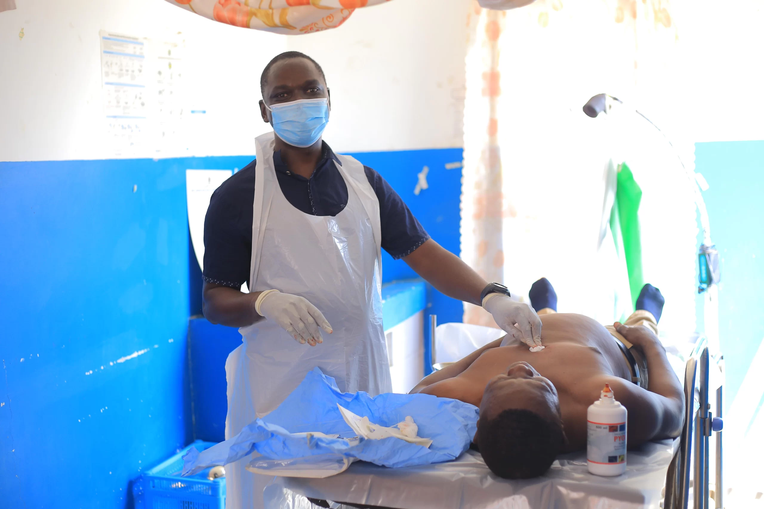 Dr. Fred gets ready to check a man's eyes at the clinic